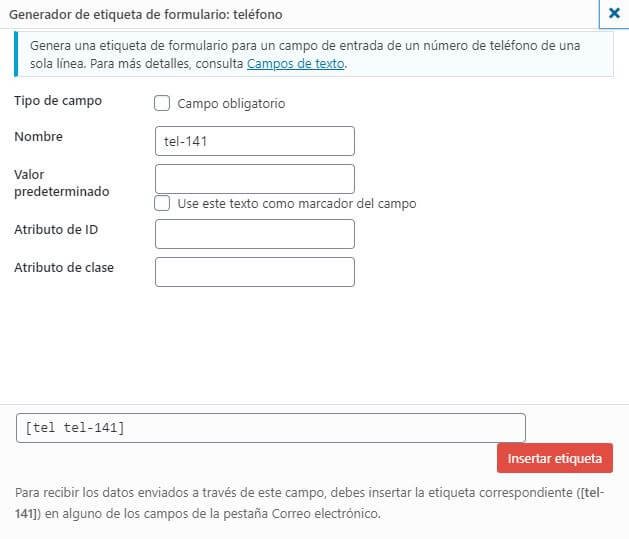 Después escribimos el nombre del campo. Este es el que va a aparecer en el formulario. En este caso vamos a escribir “teléfono” que es el campo que vamos a insertar.