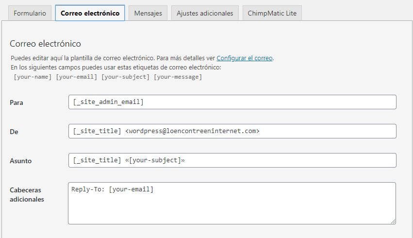 En “De” vas a cambiar el [_site_title] por [your-name] y luego pones wordpress@tudominio.com.