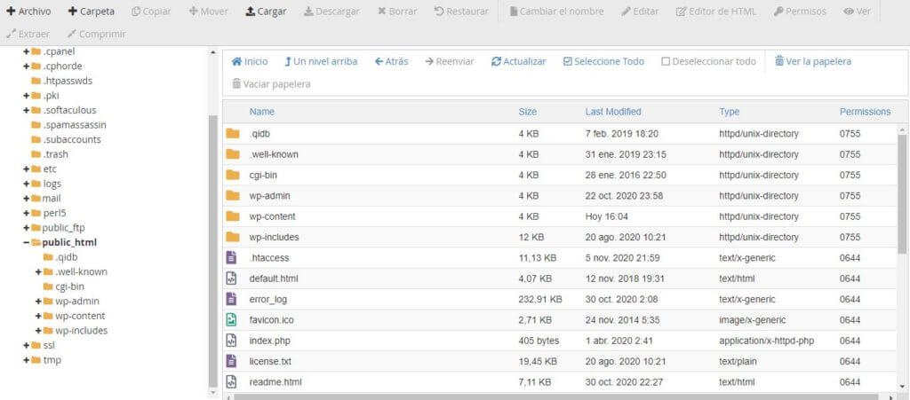 En la sección que acabas de abrir, ve a la parte izquierda y ubica la carpeta de public_html. Al darle clic, en el cuadro de la derecha te aparecerán todos los archivos almacenados en esa carpeta.