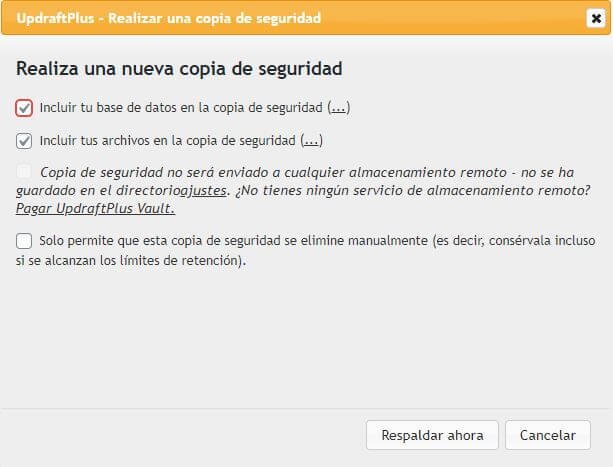 En el administrador del plugin encontrarás un botón grande que dice Respaldar ahora. Al darle clic te aparecerá la siguiente ventana: