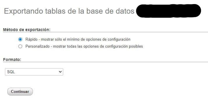 Una vez dentro, te diriges a la sección de Copia base de datos a y en el campo de texto vas a colocar el nombre de la copia de seguridad (para este ejemplo colocaré Backup) y das clic en el botón de Continuar.