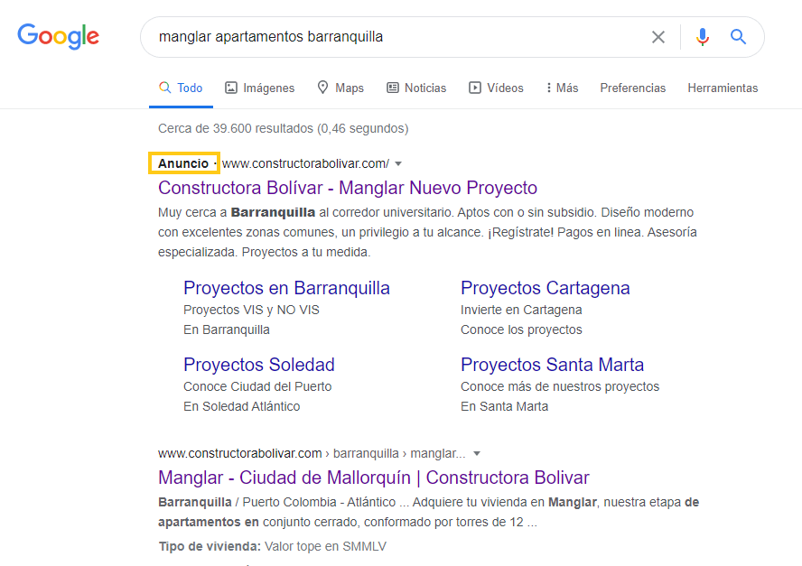 En la imagen de arriba puedes ver que el primer resultado para la búsqueda de la palabra clave, “manglar apartamentos barranquilla”, es un sitio posicionado con SEM.