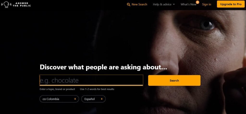 Para utilizarla solo tienes que ingresar a Answer the Public, seleccionas la ubicación geográfica y el idioma que te interesa y luego ingresas la palabra clave que quieres investigar.