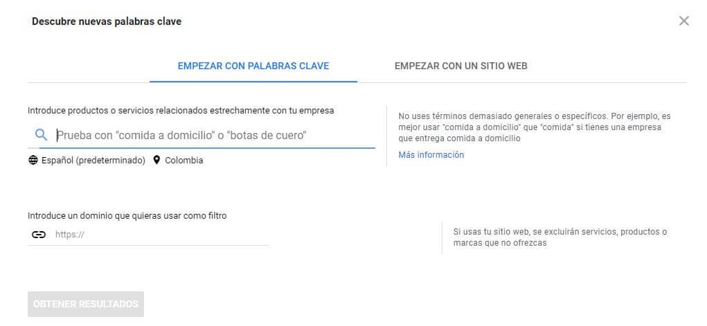 En la imagen puedes observar que aparecen dos pestañas: “Empezar con palabras clave” y “Empezar con un sitio web”.